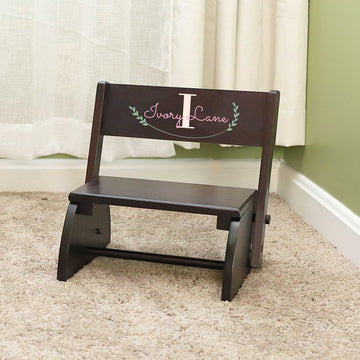 Real wood child's step stool is personalized just for them. Flip the back down and it doubles as a bench seat just perfect for toddlers and new walkers. Customized with your little one's name and choice of design makes this a one-of-a-kind gift.