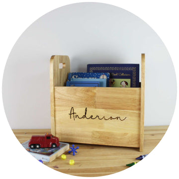 Our white or natural wood book caddy looks fantastic with any name and/or message laser engraved on it! This is a perfect gift to add to any family room, office or nursery. Makes an ideal gift for everyone. Roomy enough to hold even oversized books. Super easy assembly OR have our handyman assembly before it ships for a small fee.
