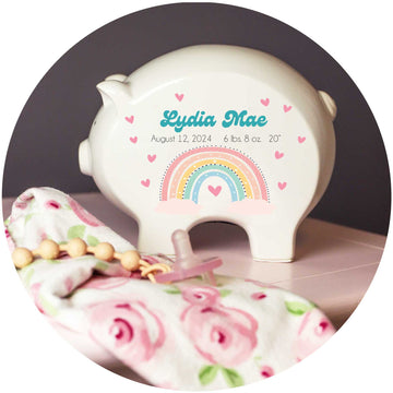 A penny saved is a penny earned. Our My Bambino personalized is customized with your child's name both front and back. Coin slot on top takes folded dollar bills too. Removable plastic plug on the bottom for early withdrawals. Choose font, font color, name, and design to match your babies room decor or child's tastes. Measures 8.75"l x 7"h x 4.25"w.