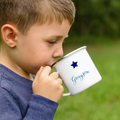 Sip or swig your favorite beverage from this lightweight, durable, enamel mug. Perfect for hot of cold drinks for child or adult. Glossy white mug with stainless steel rim is adorn with vivid design and personalization of your choice. Holds 12 0z. - Measures 3" x 3.25". Hand washing recommended.