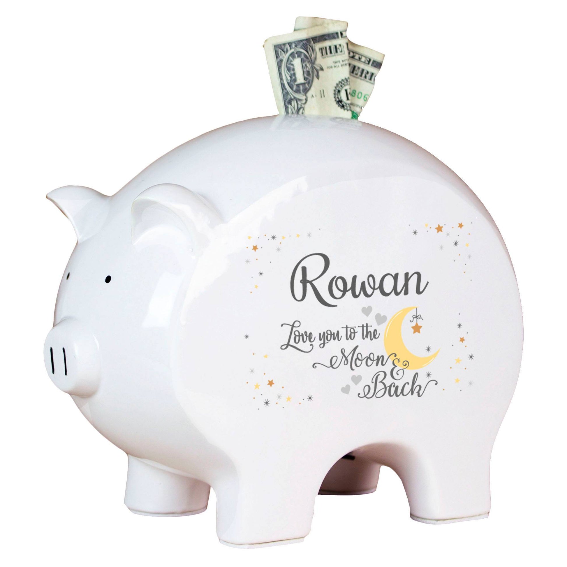 This personalized Moon & Back design piggy bank is customized on both front and back. The slot on top accepts coins and folded dollars. Removable stopper is ideal for emergency withdrawals. Choose from one line to three lines of personalization for free. Available in three sizes, large being our most popular.