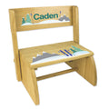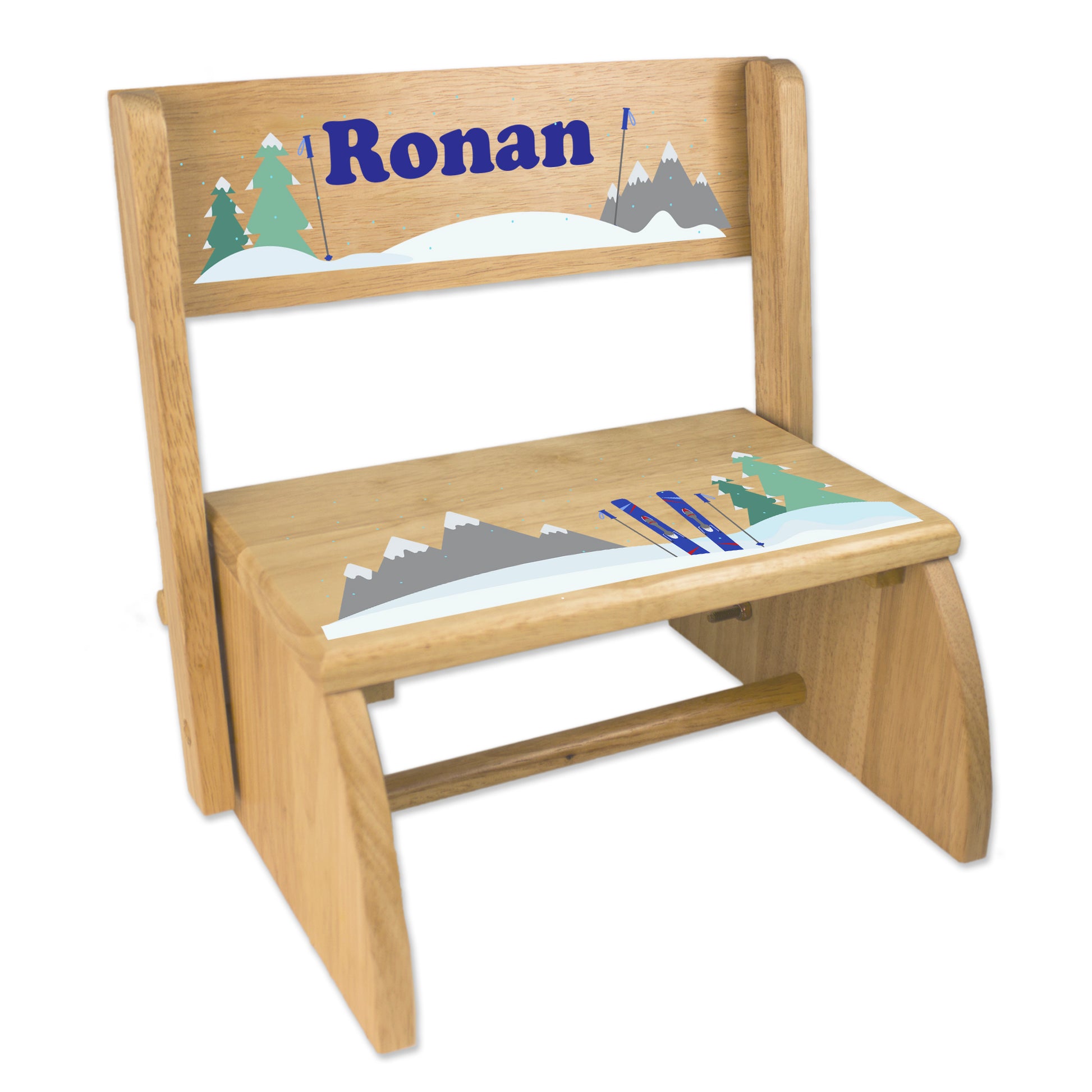 Help them reach new heights! Our MyBambino Personalized Natural Flip and Folding Step Stool with Mountain Ski design can be used as both a stool and a seat. Hinged back folds down, converting toddler seat to a step stool. Real wood but light enough for child to transport between bedrooms, kitchens, and bathrooms. Measures 12" x 12" x 6" - seat is 5 1/2" from floor. Assembly required or for an added fee our staff can assemble before shipping.