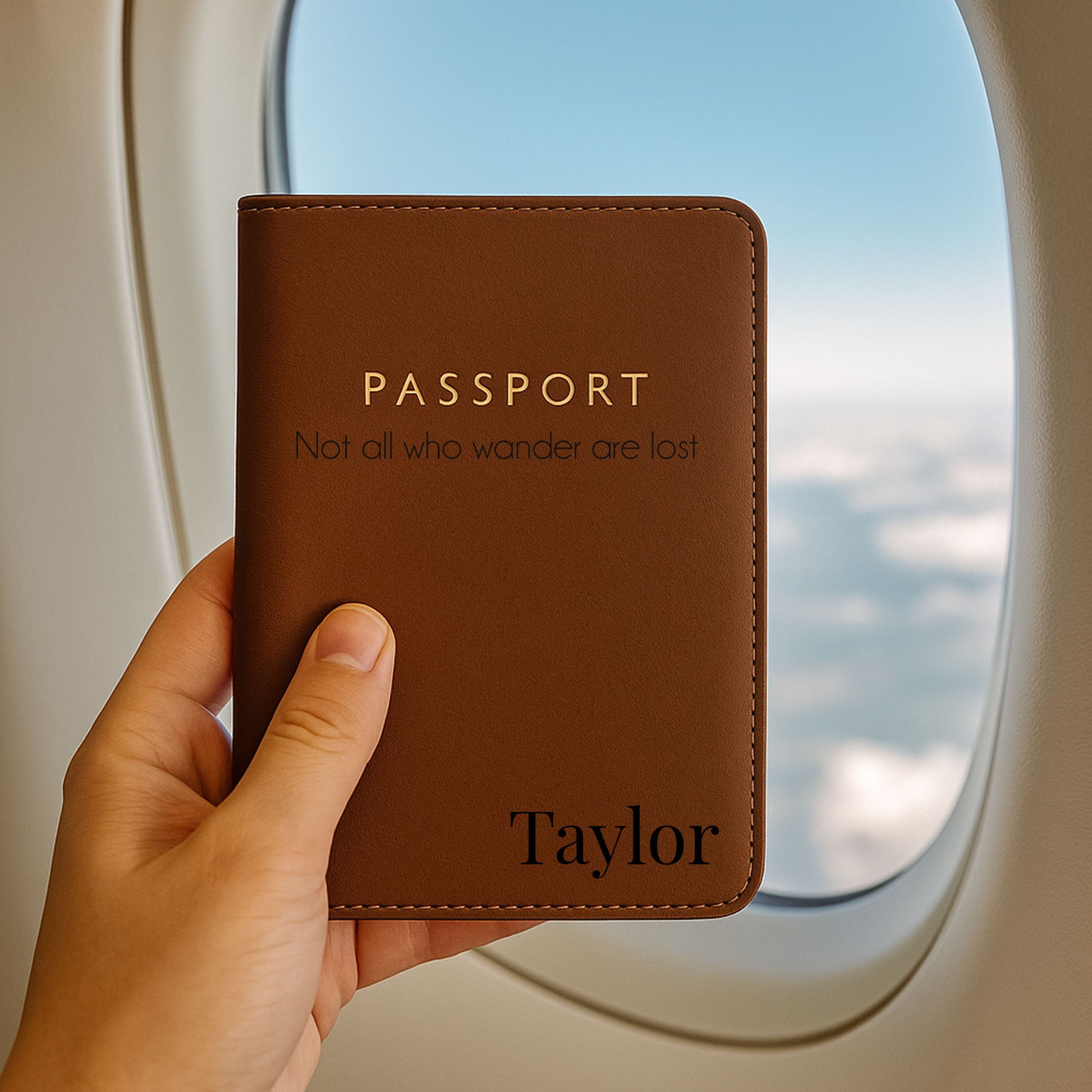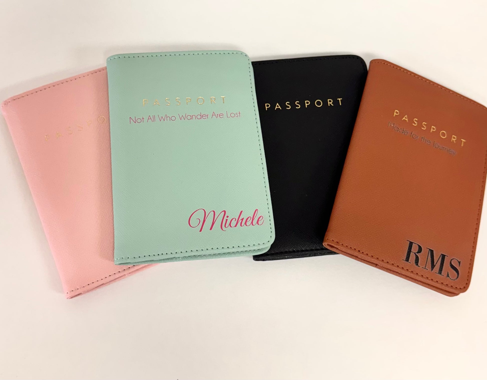 Travel in style with our custom passport holder, available in black, pink, light turquoise, and brown. Made from durable, waterproof faux leather, this travel wallet is designed to last through every adventure. Personalize with your initials, name, or a special message for a one-of-a-kind touch. The interior includes secure space for a standard U.S. passport, driver’s license, cash, and credit cards—keeping all your essentials organized in one sleek case. Perfect for frequent flyers or thoughtful gifts, this compact passport cover measures 4" x 5.7".