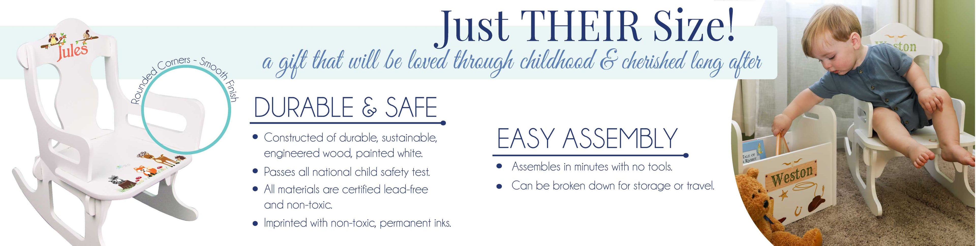 Rock a bye baby! My Bambino's Personalized Child's Robot Puzzle Rocking Chair assembles with ease. No nuts or bolts or tools needed. Makes a wonderful statement in any room or nursery and will have them rocking the day away!